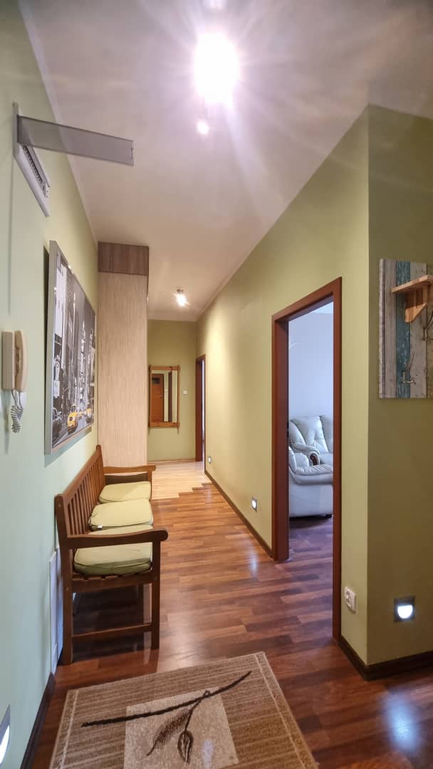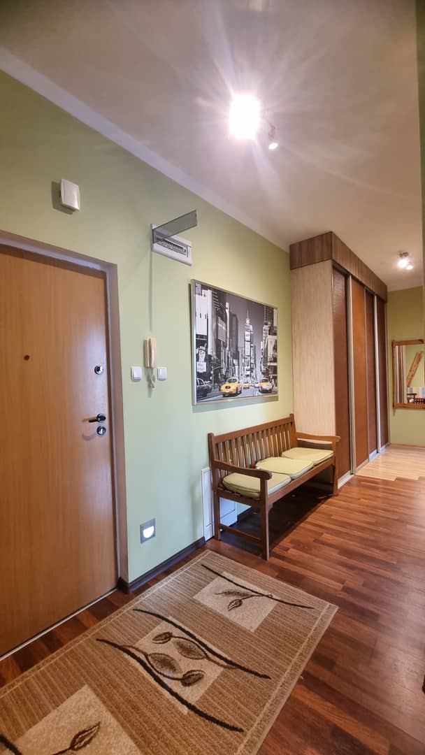 2 pokoje (salon, sypialnia z garderobą), kuchnia, łazienka, przedpokój z dużą szafą wnękową. Balkon