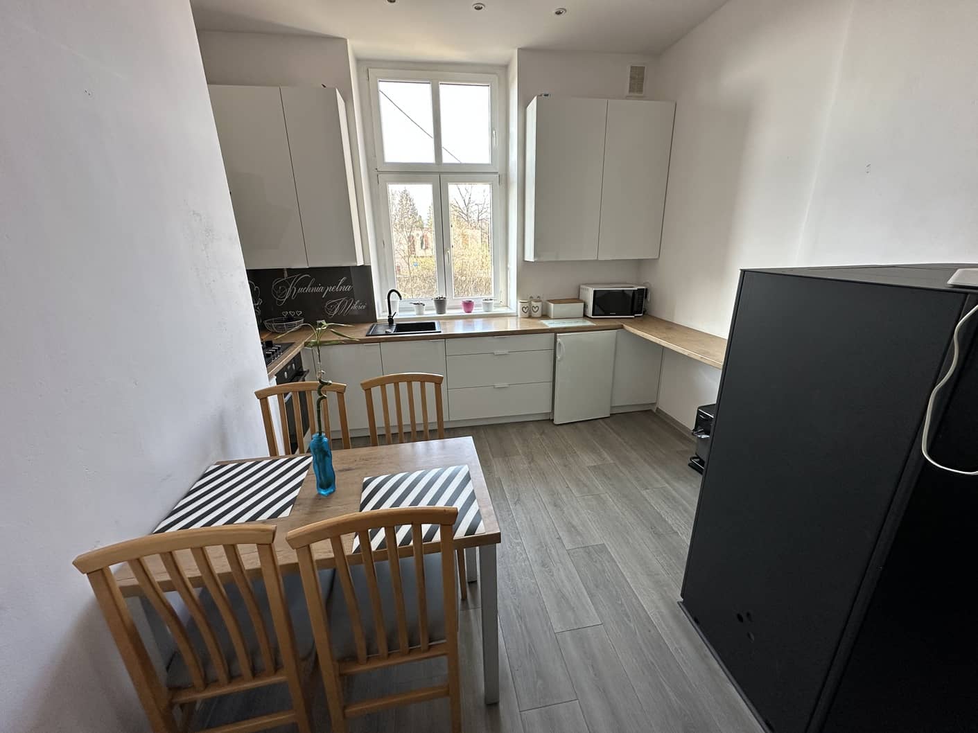 W cenie mieszkania kompletnie wyposażona kuchnia (zabudowa kuchenna robiona na wymiar wraz ze sprzętem AGD). duża szafa w dużym pokoju.