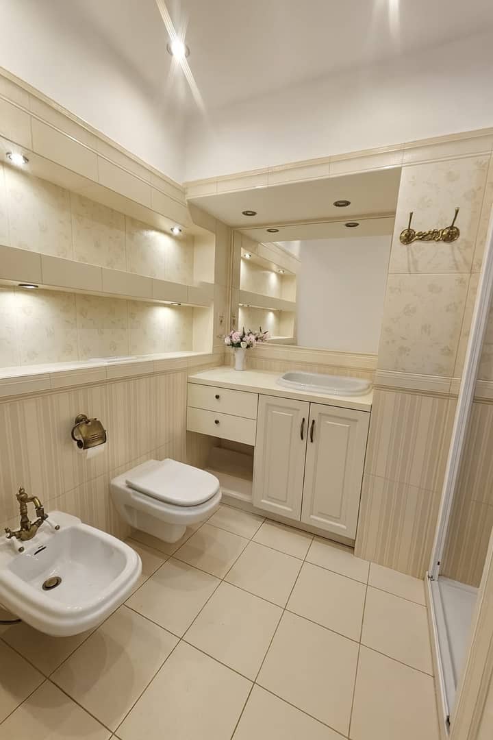 Duża łazienka z prysznicem i bidetem komfort i elegancja - wykończona mosiądzem