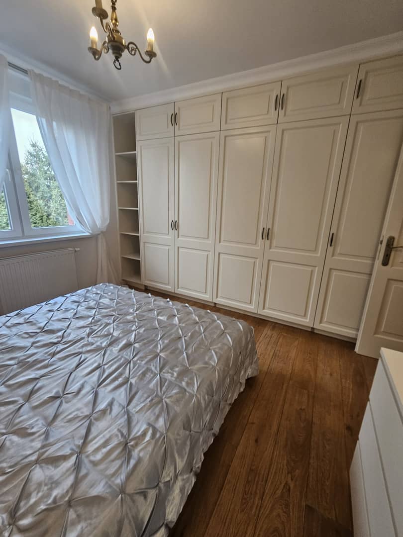 Klimatyczną sypialnie z dużą szafą w zabudowie.