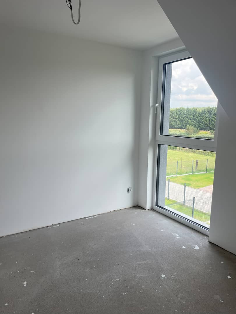 jasny i przestronny salon z dużym oknem balkonowym i miejscem na instalację kominka,