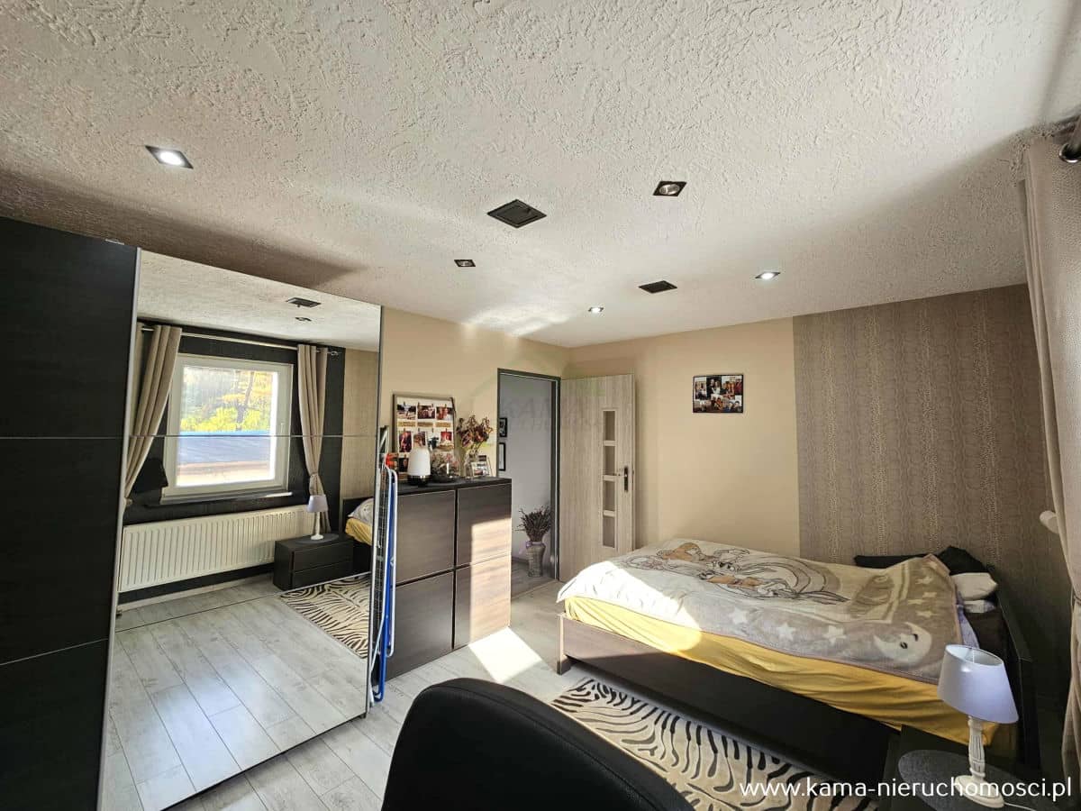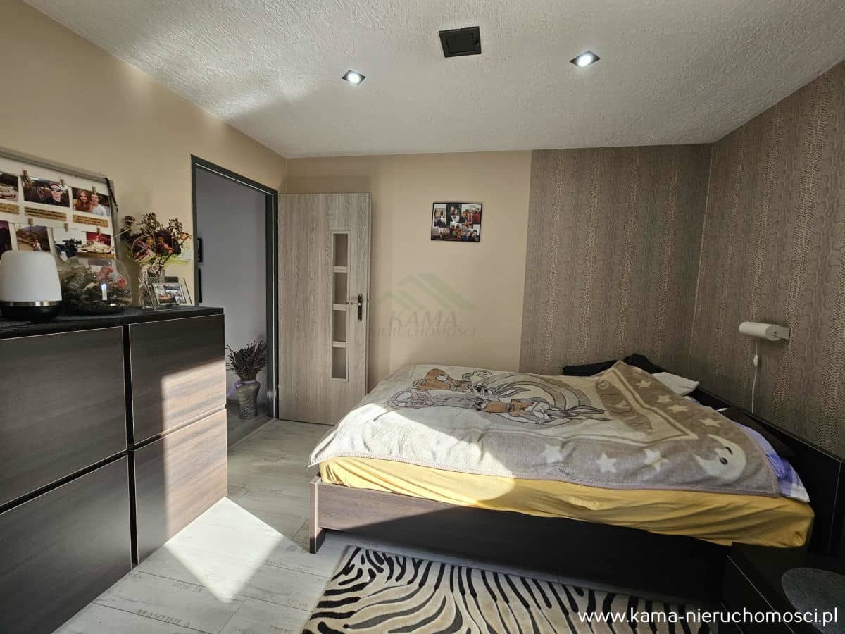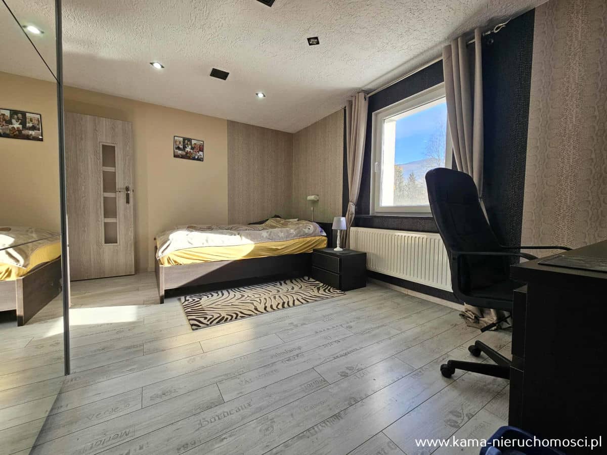 - dwie komfortowe sypialnie, z których jedna została zaadaptowana na garderobę, zapewniając dodatkową przestrzeń do przechowywania,