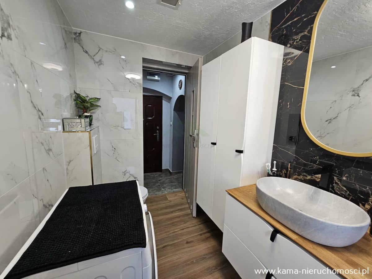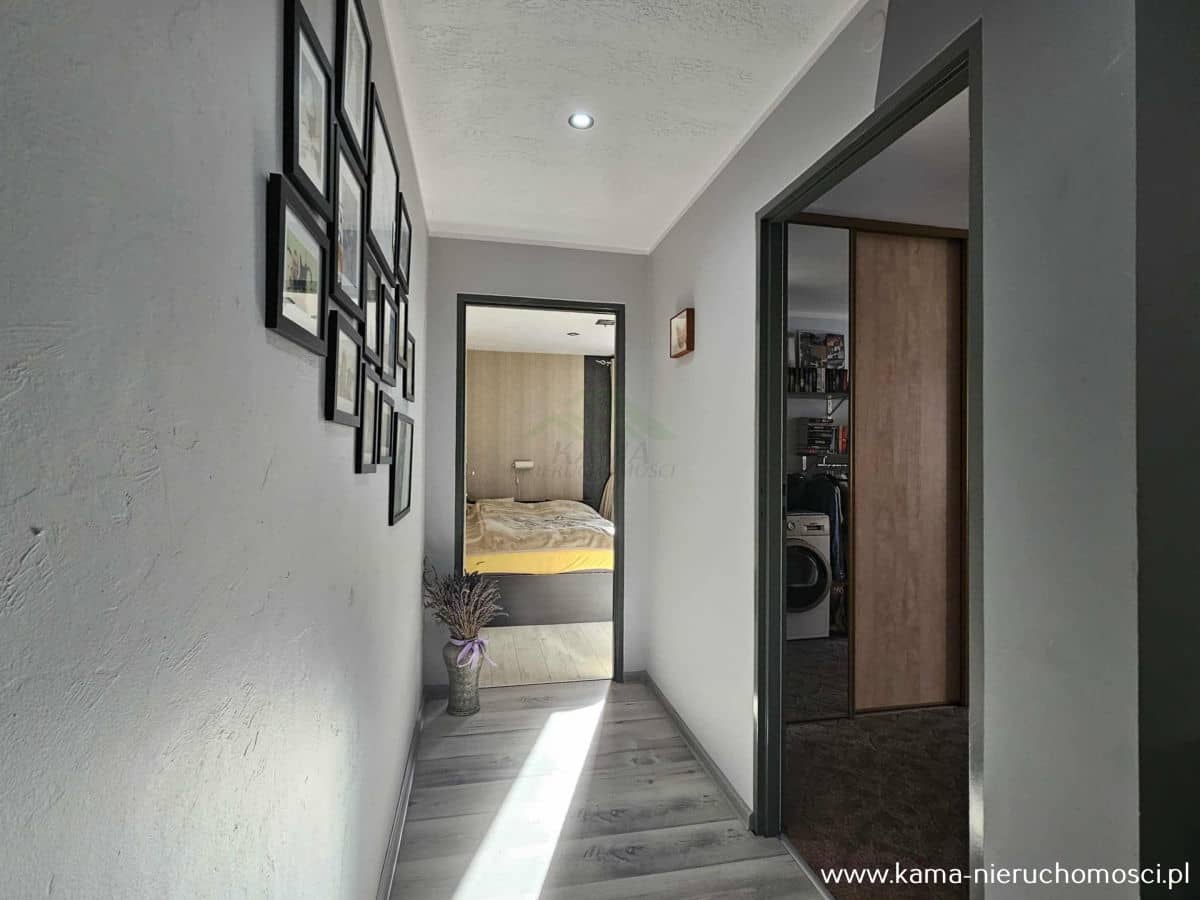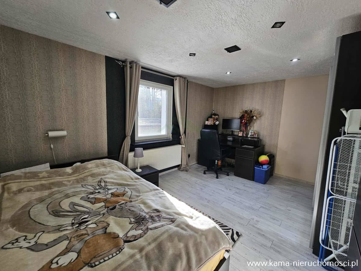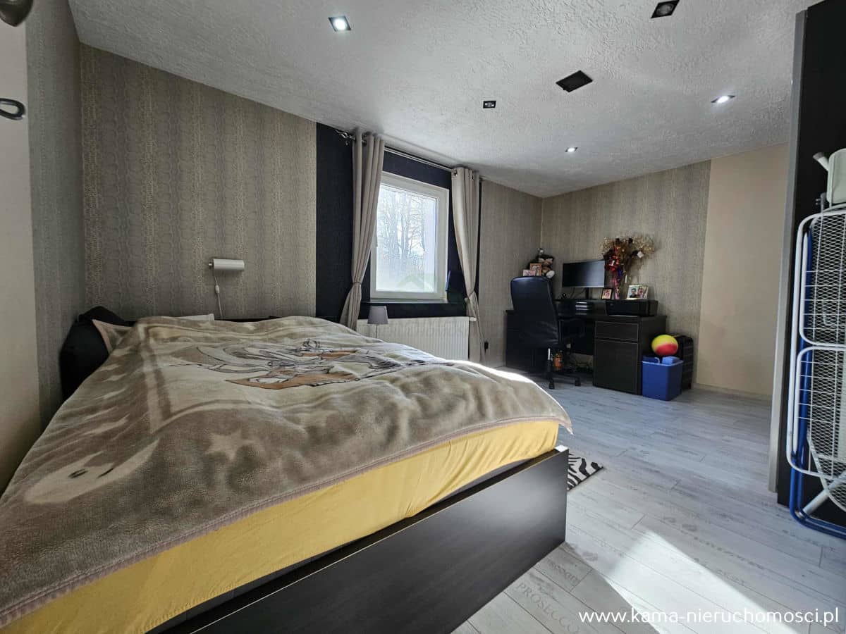 - dwie komfortowe sypialnie, z których jedna została zaadaptowana na garderobę, zapewniając dodatkową przestrzeń do przechowywania,