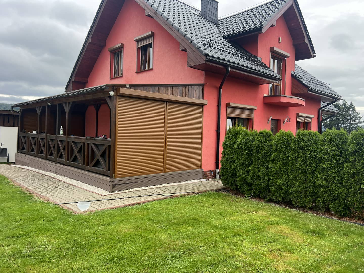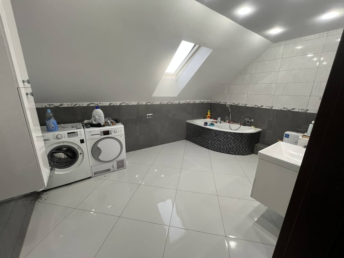 Dom o powierzchni 160m2, 5 pokoi , 2 łazienki , strych , dwa garaże , salon połączony z aneksem kuchennym .