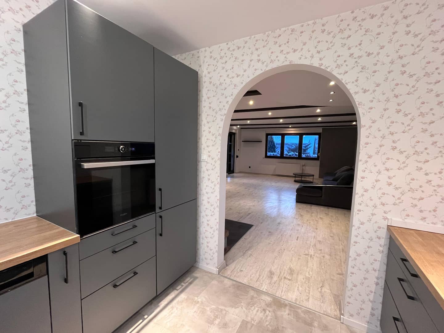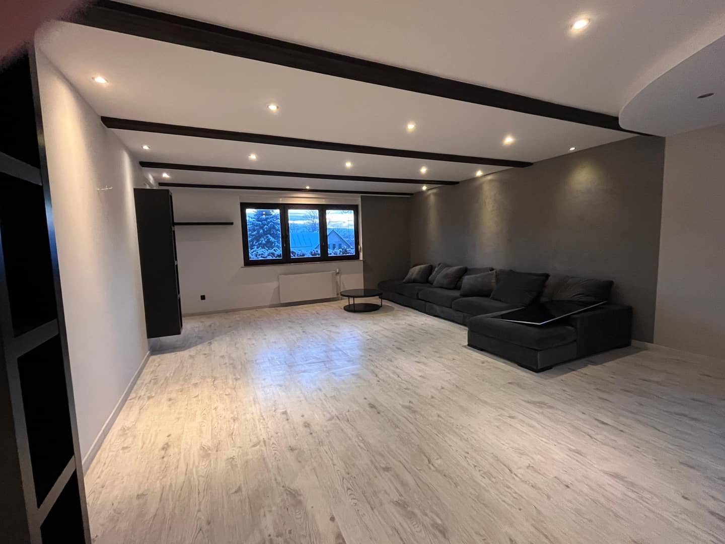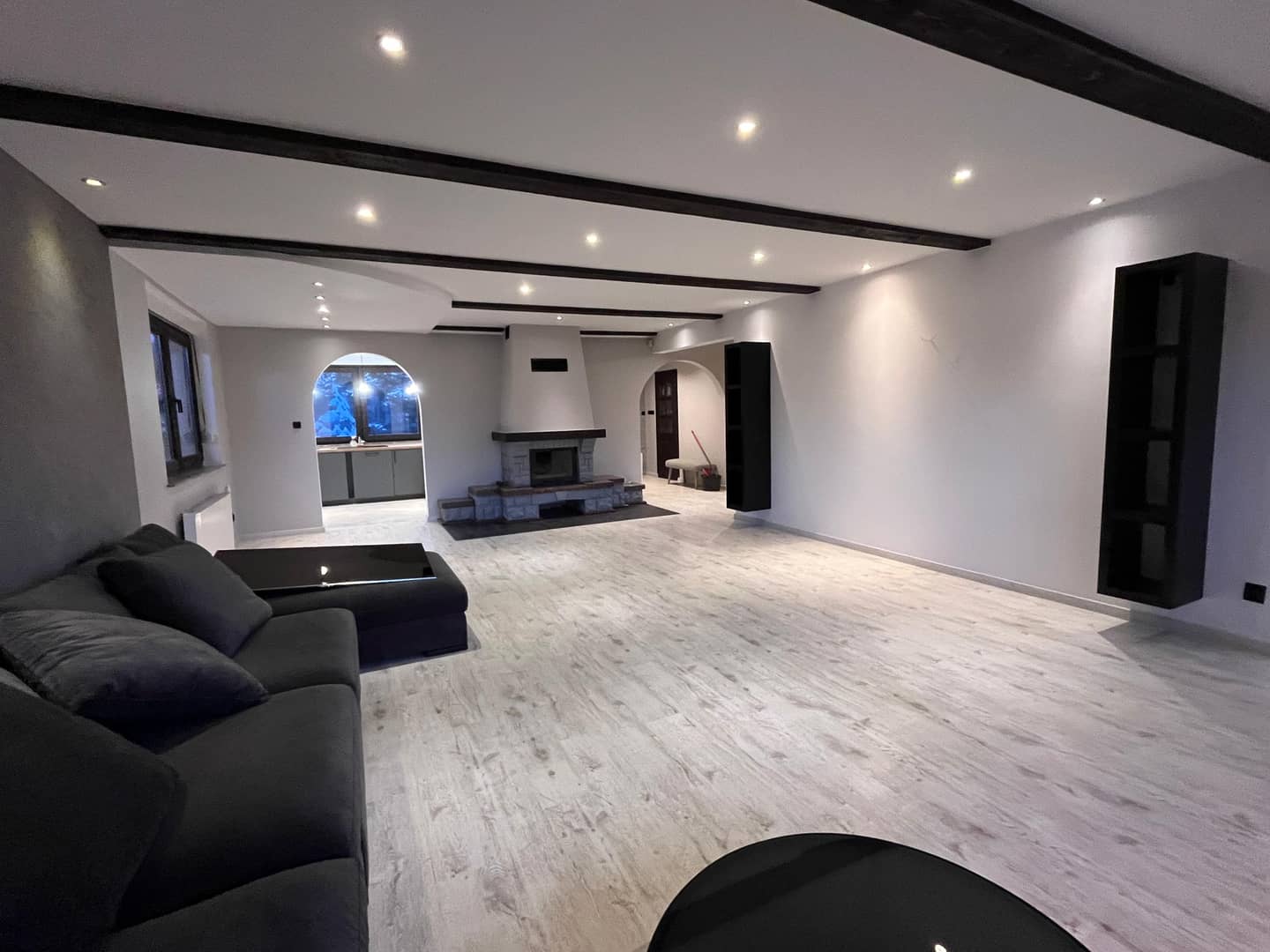 duży, jasny salon połączony z kuchnią