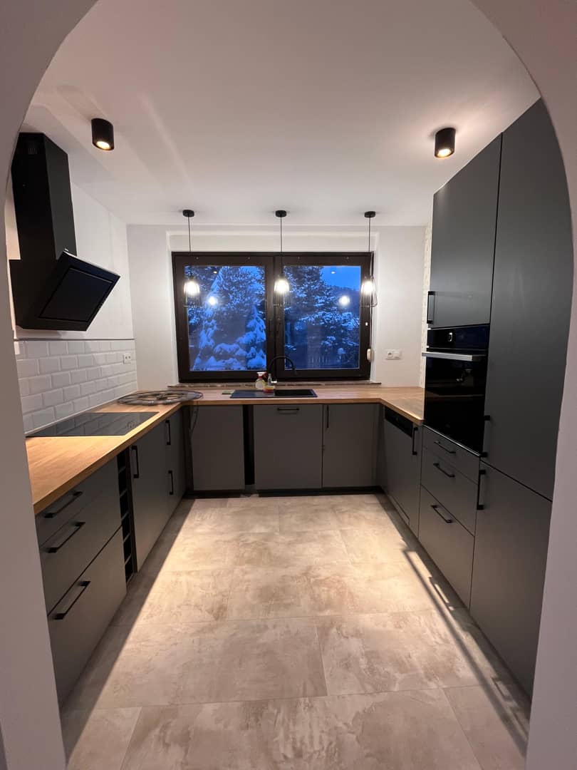 kuchnia z wyposażeniem: piekarnik, płyta, zmywarka