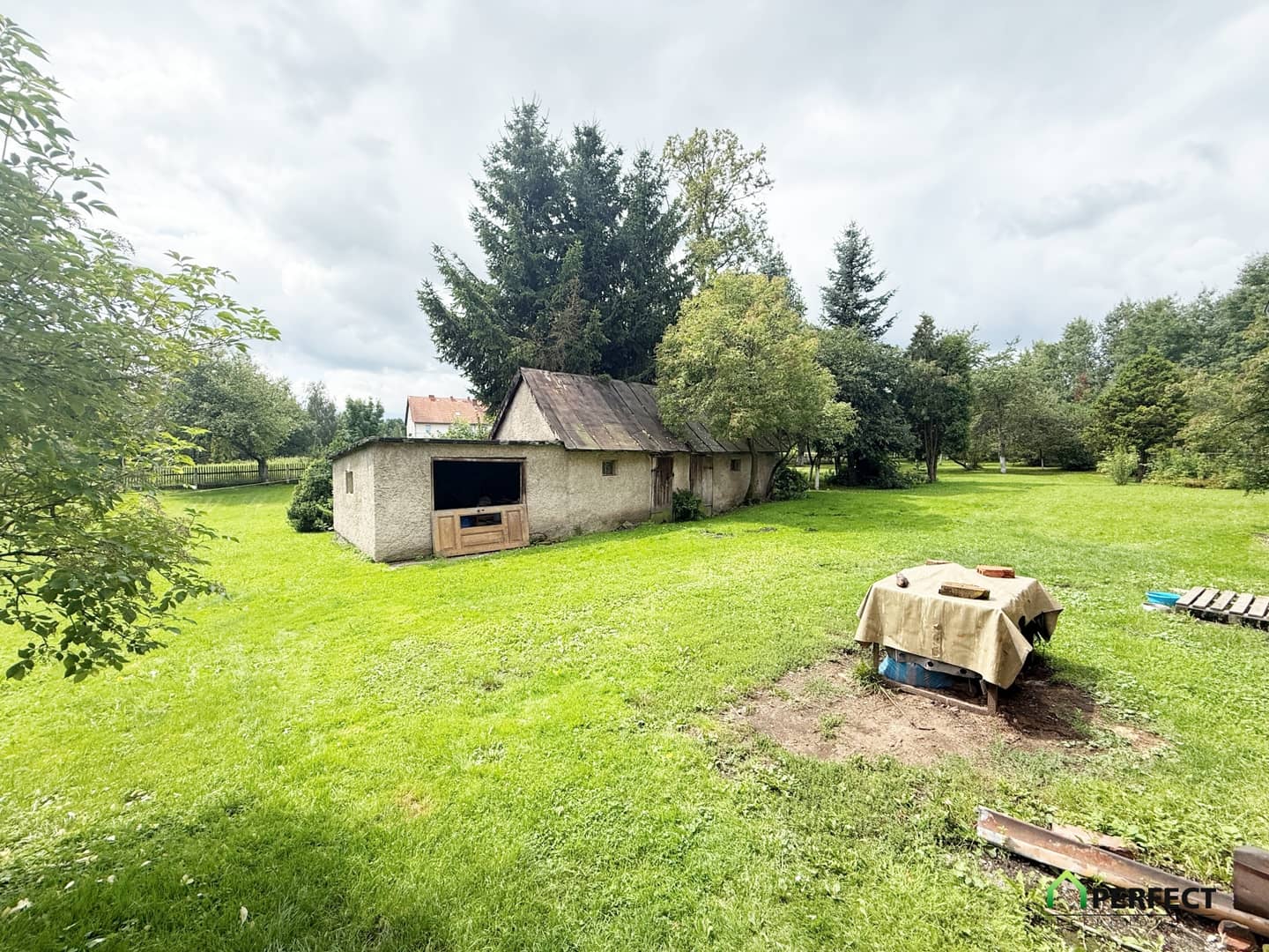 Działka zagospodarowana, prostokątna, z dostępem do drogi asfaltowej. Na jej terenie, oprócz domu, znajdują się dwa budynki gospodarcze oraz garaż (blaszak).