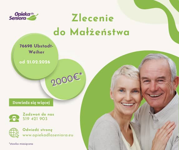 Zlecenie do Małżeństwa 76698 Ubstadt-Weiher / Stettfeld / Badenia-Wirtembergia Od 21.02.2026 do 2000 EURO + opłacony przejazd Wymagania: - komunikatywna znajomość języka niemieckiego