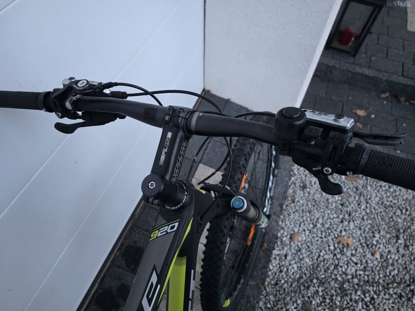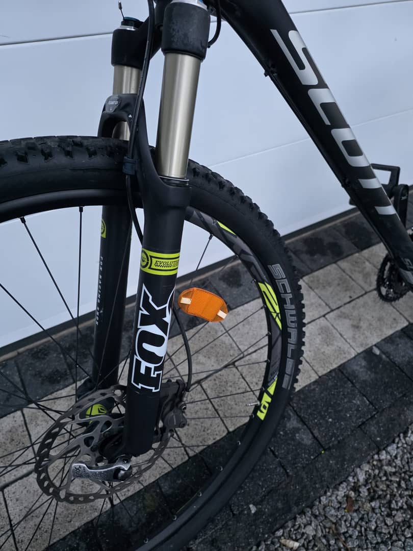 - amortyzator FOX 34 na sztywnej piaście, powietrzny regulowany z blokadą skoku przy kierownicy