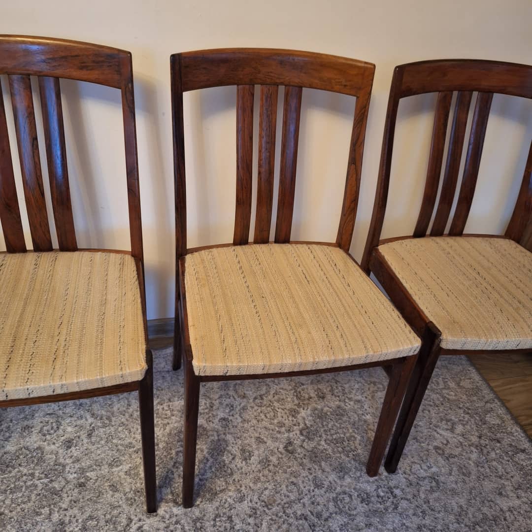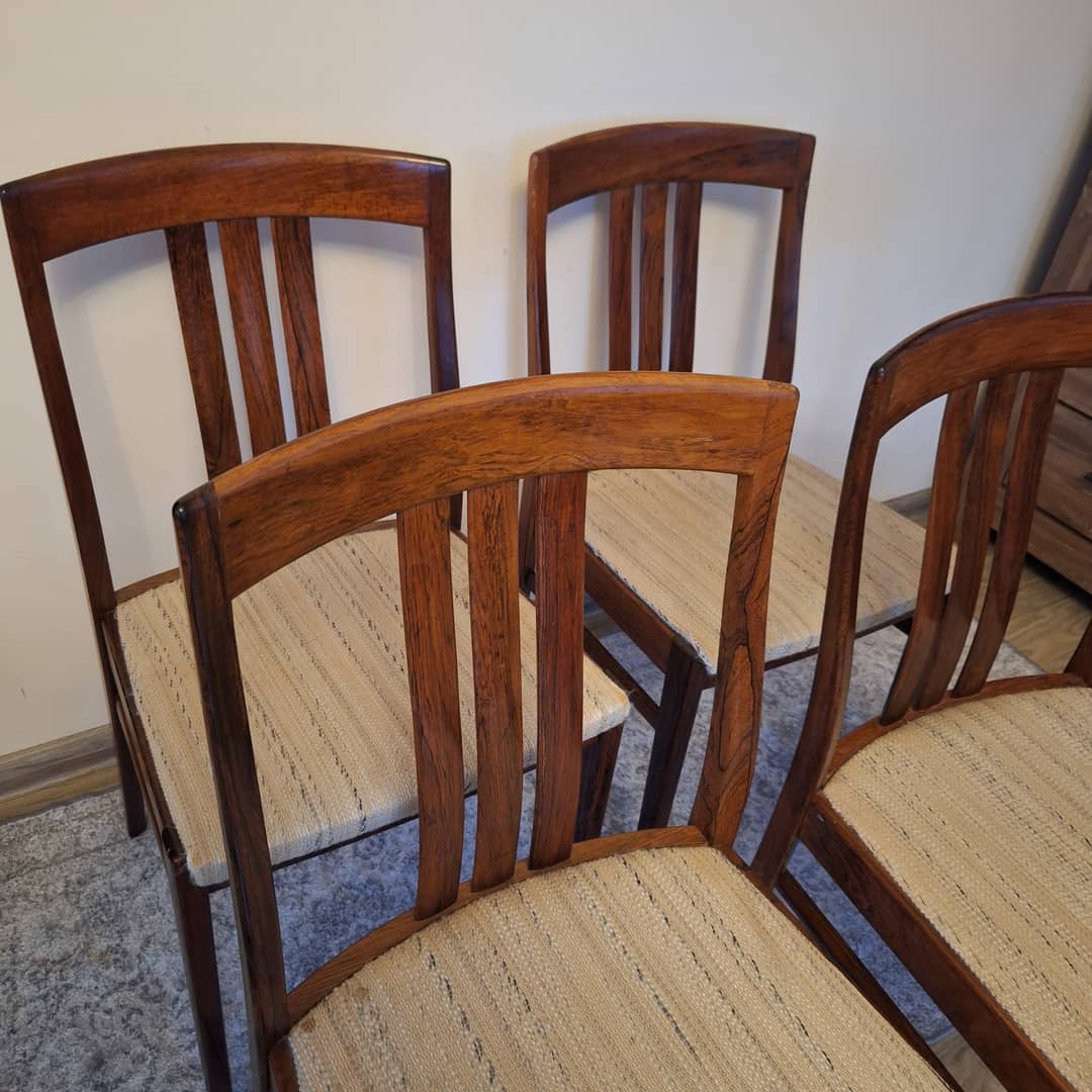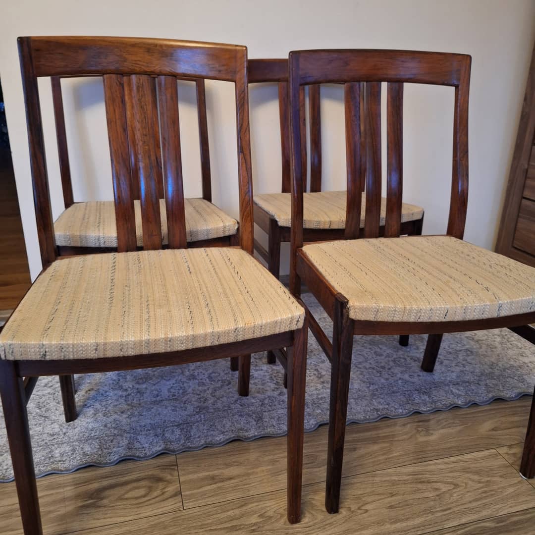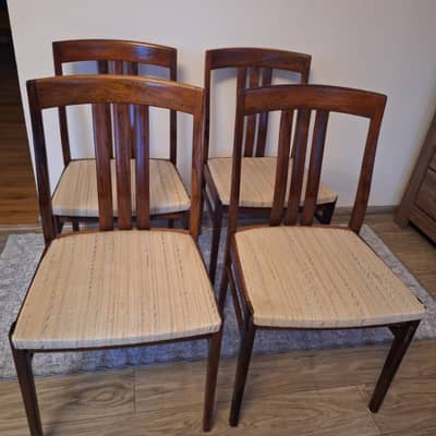 Cztery krzesła z drewna teakowego, duńskie, lata 70, styl Vintage. Minimalistyczny wzór, bardzo wygodne, oryginalny materiał. Cena 280 za komplet. Możliwy transport.