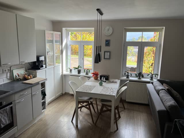 Salon z aneksem kuchennym , wyjściem na ogród.