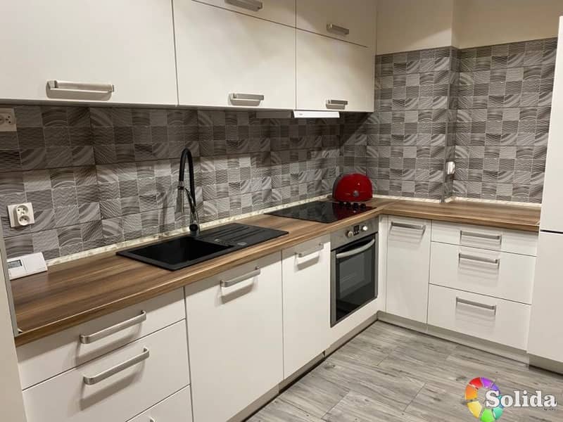 Kuchnia wyposażona w meble kuchenne wykonane na zamówienie, ze sprzętem AGD (lodówka, zmywarka, płyta indukcyjna, piekarnik, pochłaniacz).