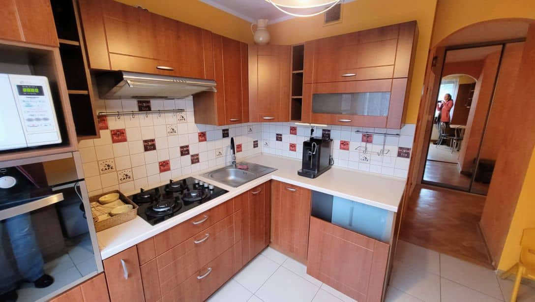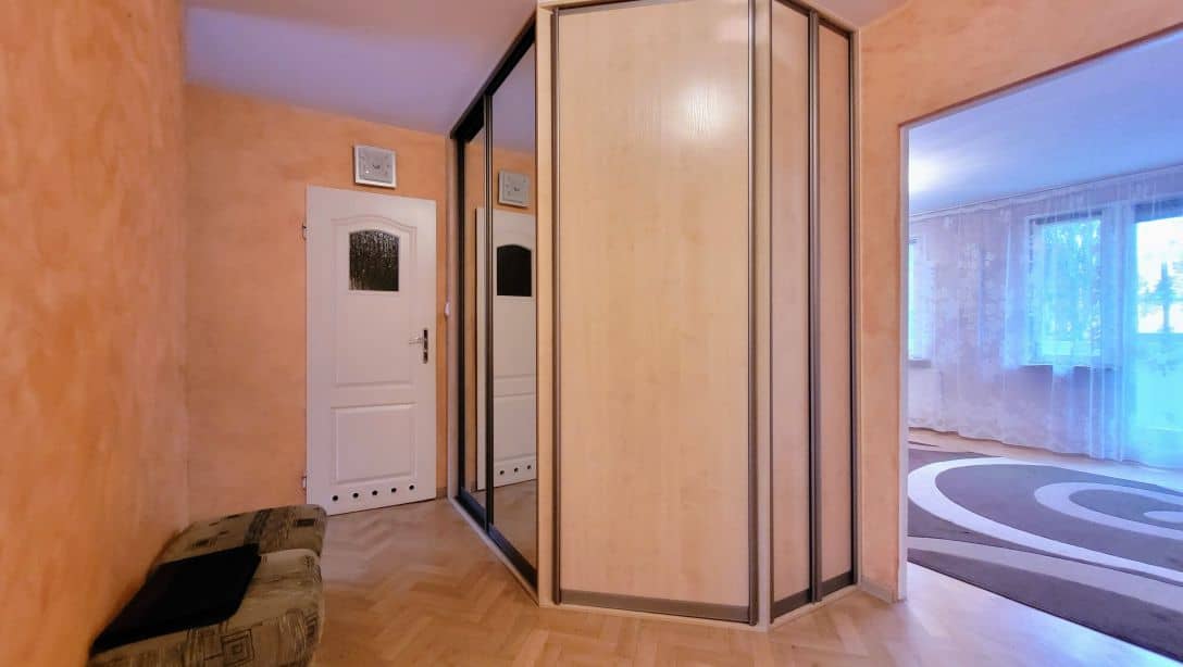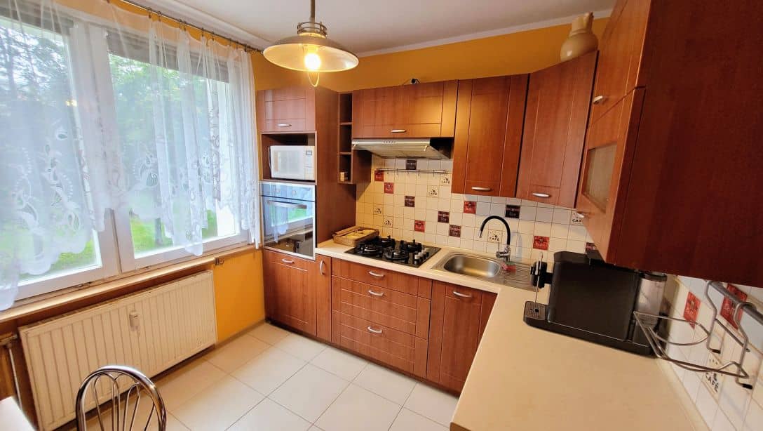 - kuchnia wykafelkowana z zabudową i sprzętem AGD (płytą gazową, lodówką i piekarnikiem oraz miejscem na zmywarkę), łazienka gustownie wykafelkowana z toaletą, kabiną prysznicową i miejscem na wąską pralkę ładowaną od góry, okna drewniane tylko w jednej sypialni wymienione na pcv, drzwi wewnętrzne nowszego typu, wejściowe antywłamaniowe, , na podłodze w pokojach i przedpokoju jest parkiet w bardzo dobrym stanie, w pozostałych pomieszczeniach są kafle, w przedpokoju wygodna i pojemna szafa w zabudowie