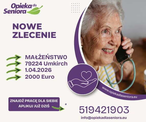 Zlecenie do Seniora 23730 Sierksdorf/ Szlezwik-Holsztyn Od 7.04.2026 Na 6 tygodni do 1900 EURO + opłacony przejazd Wymagania: - mocno komunikatywna znajomość języka niemieckiego - pr