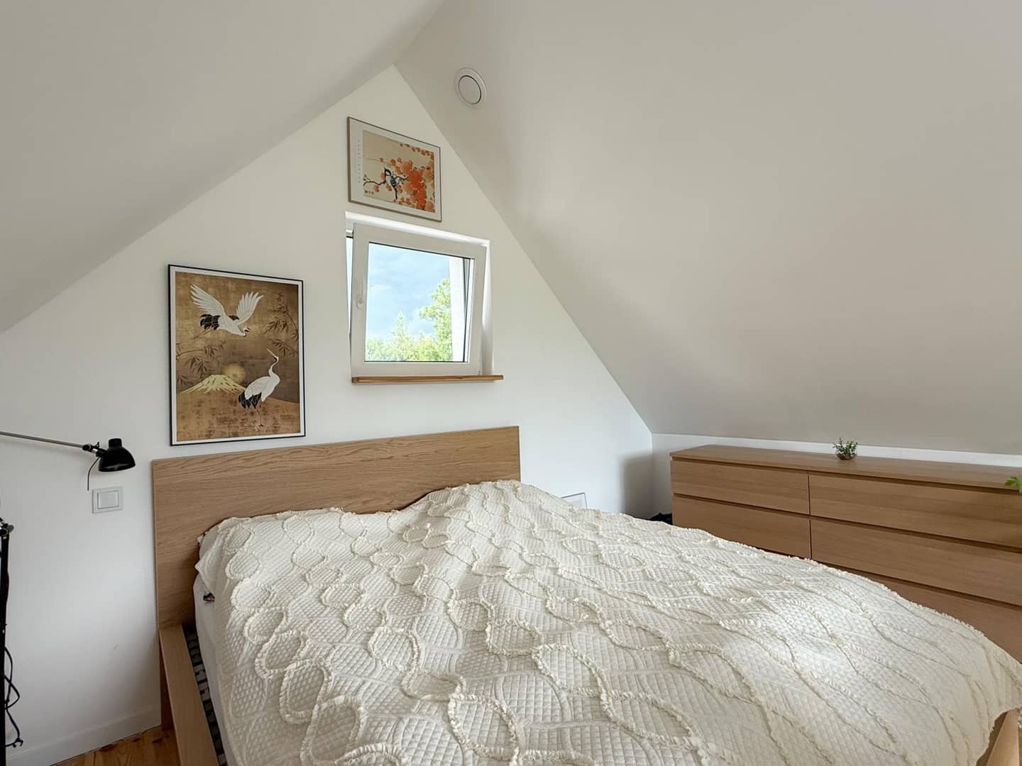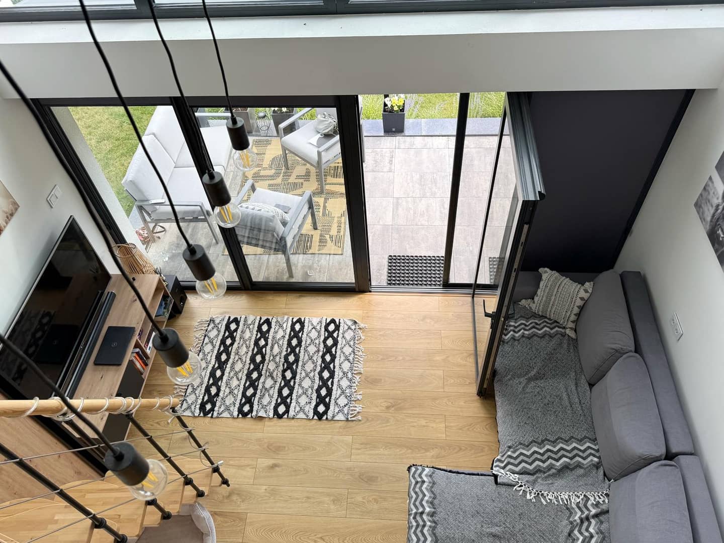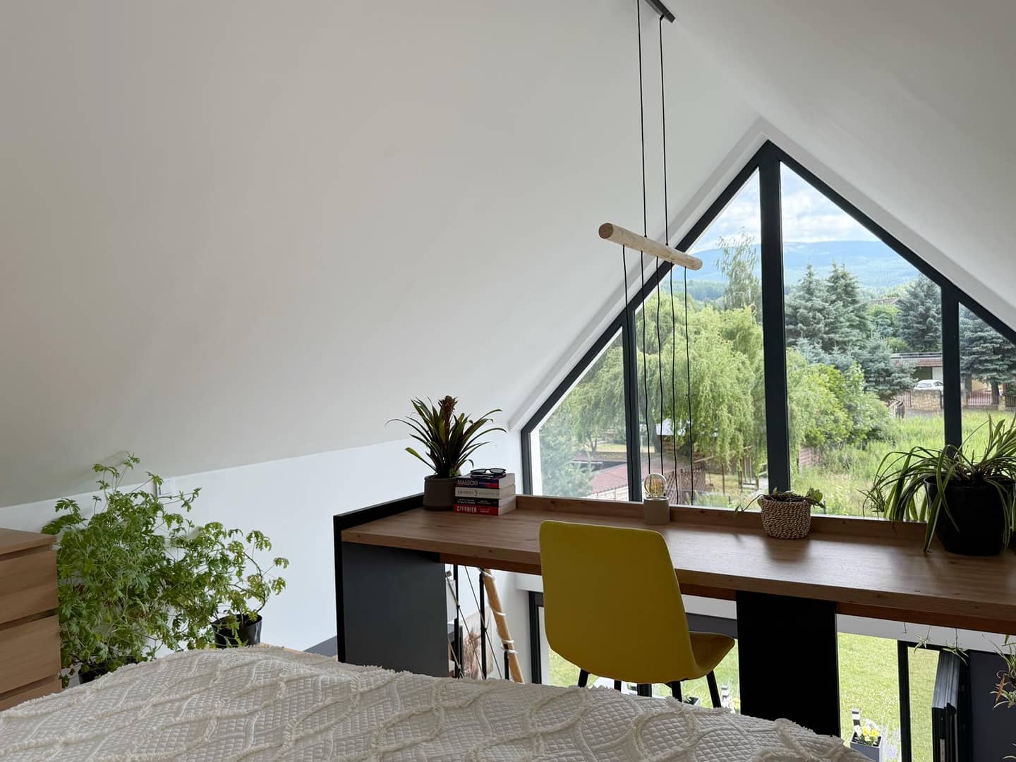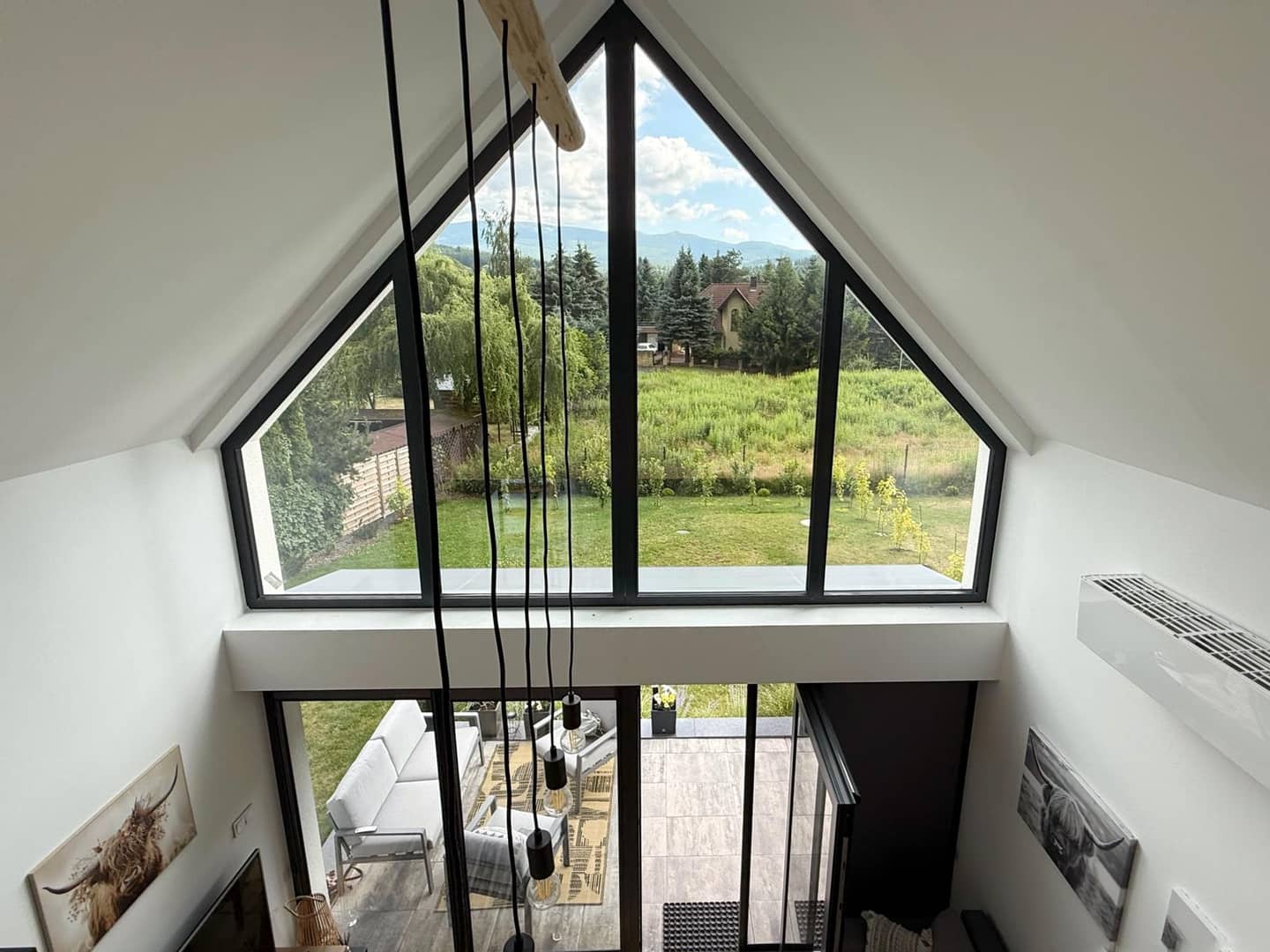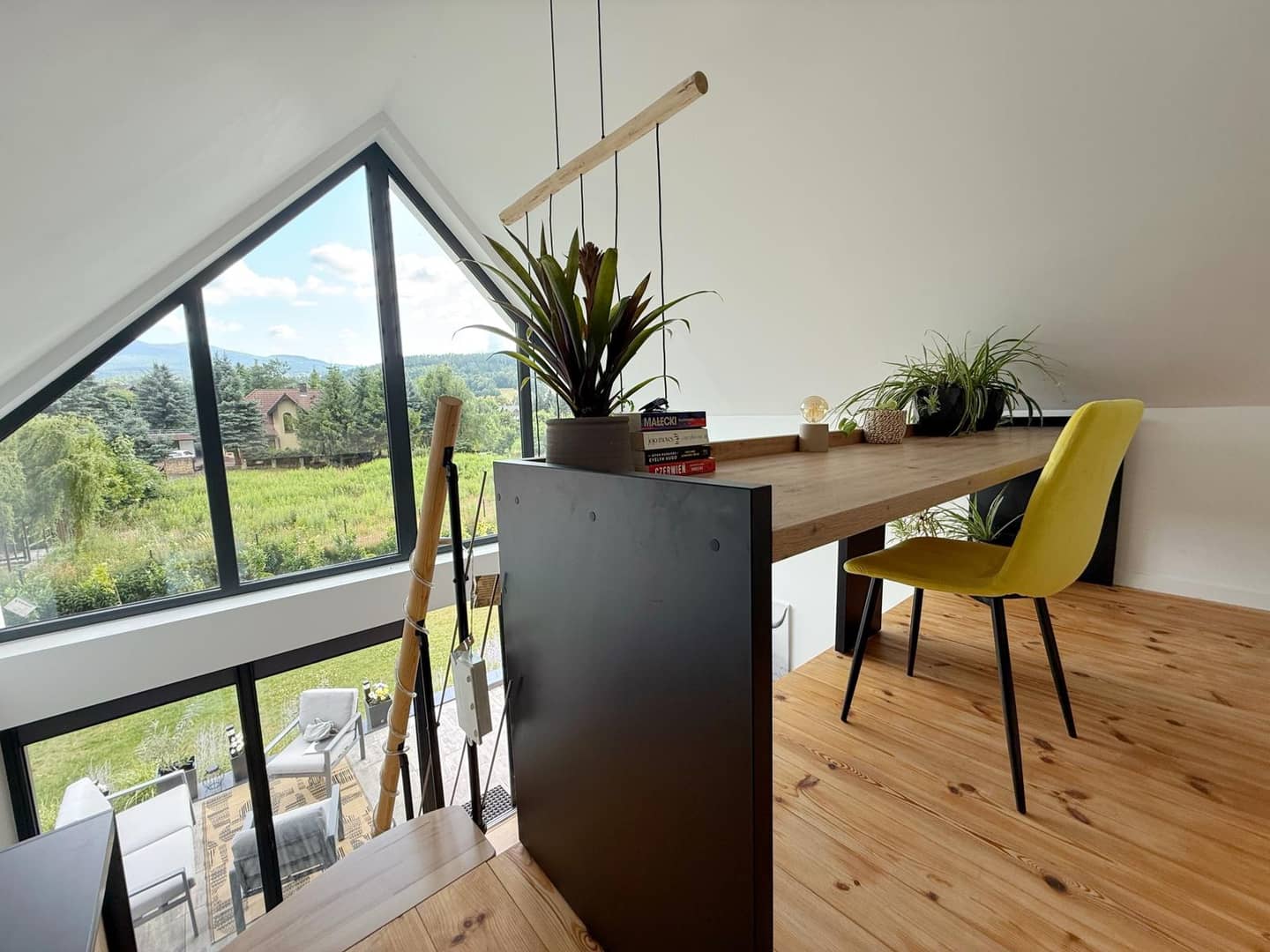 sypialni, która urządzona jest na antresoli z pięknym widokiem na góry.
