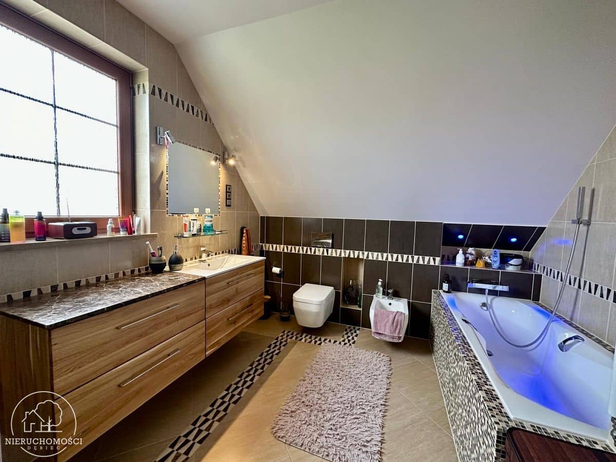 -duża łazienka wyposażona w wannę oraz kabinę prysznicową.