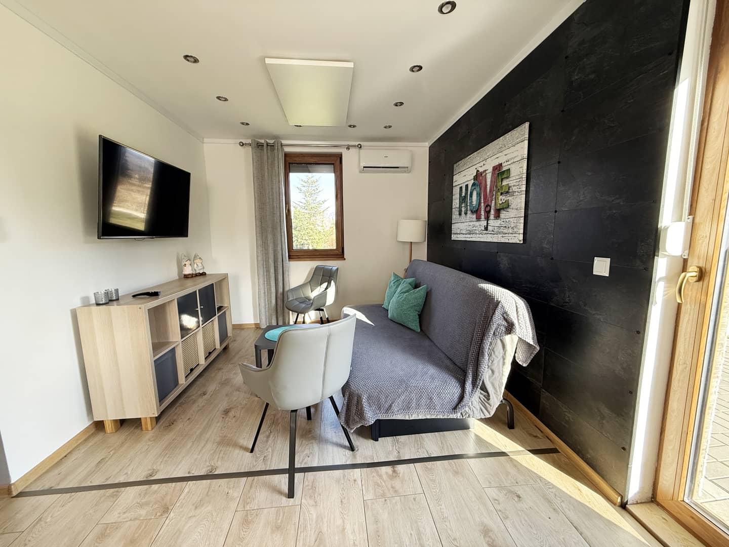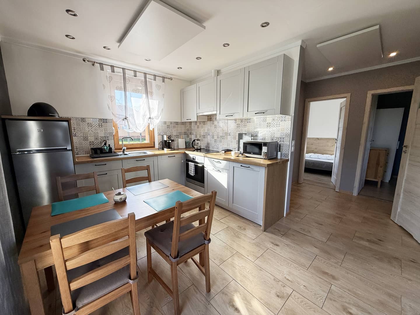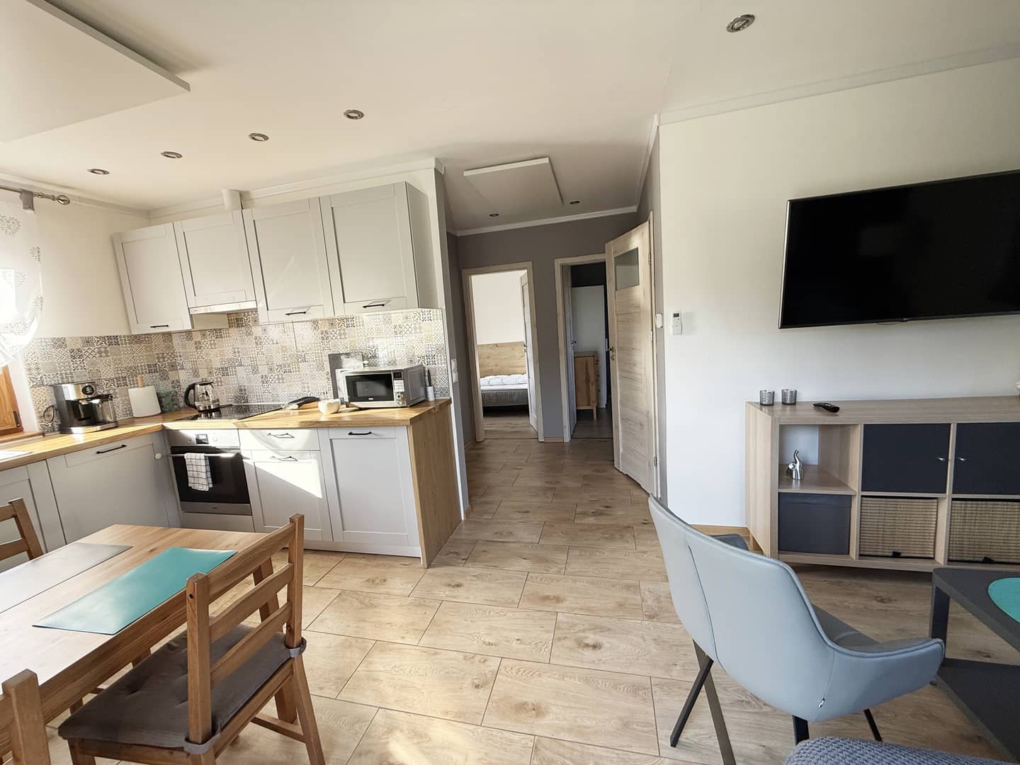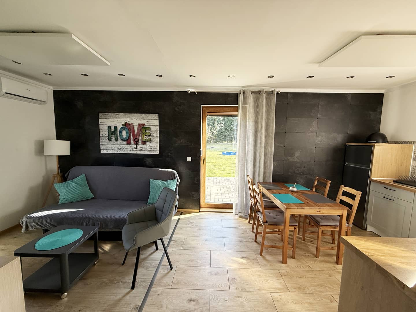 - pokój dzienny z aneksem kuchennym i wyjściem na taras;