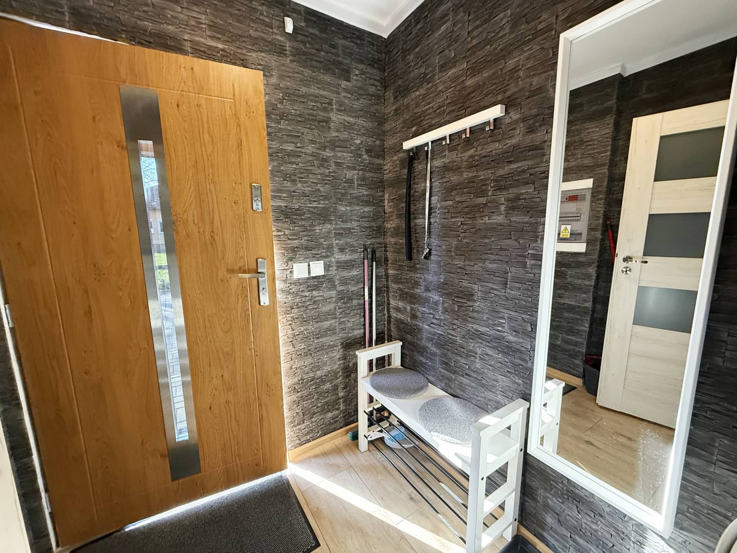 Okna PCV z zewnętrznymi roletami, na podłogach panele i kafle.