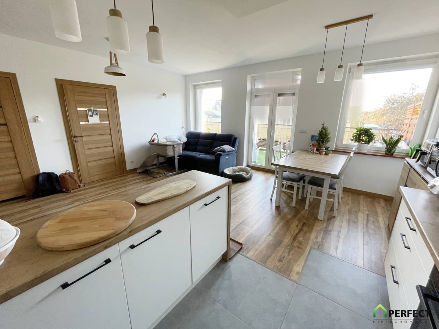 * salon z aneksem kuchennym oraz wyjściem na taras (o pow. ok. 30m2)