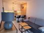 przestronny salon z balkonem i aneksem jadalnym i kuchnią wyposażoną w niezbędne sprzęty,