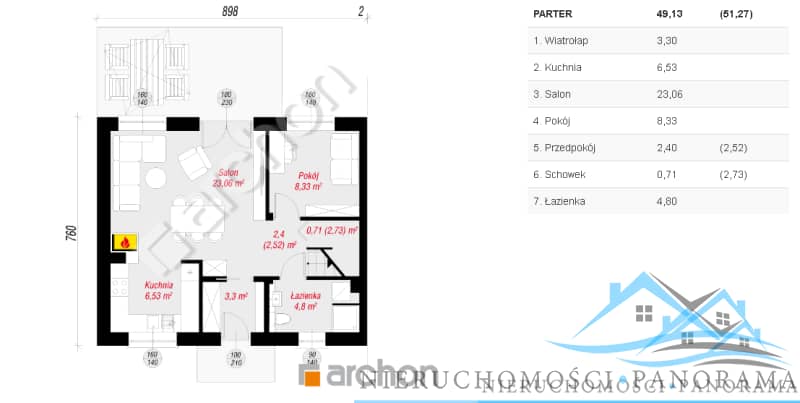 Parter: wiatrołap, salon z miejscem na aneks kuchenny i wyjściem na ogródek, sypialnia, łazienka z kabiną prysznicową;