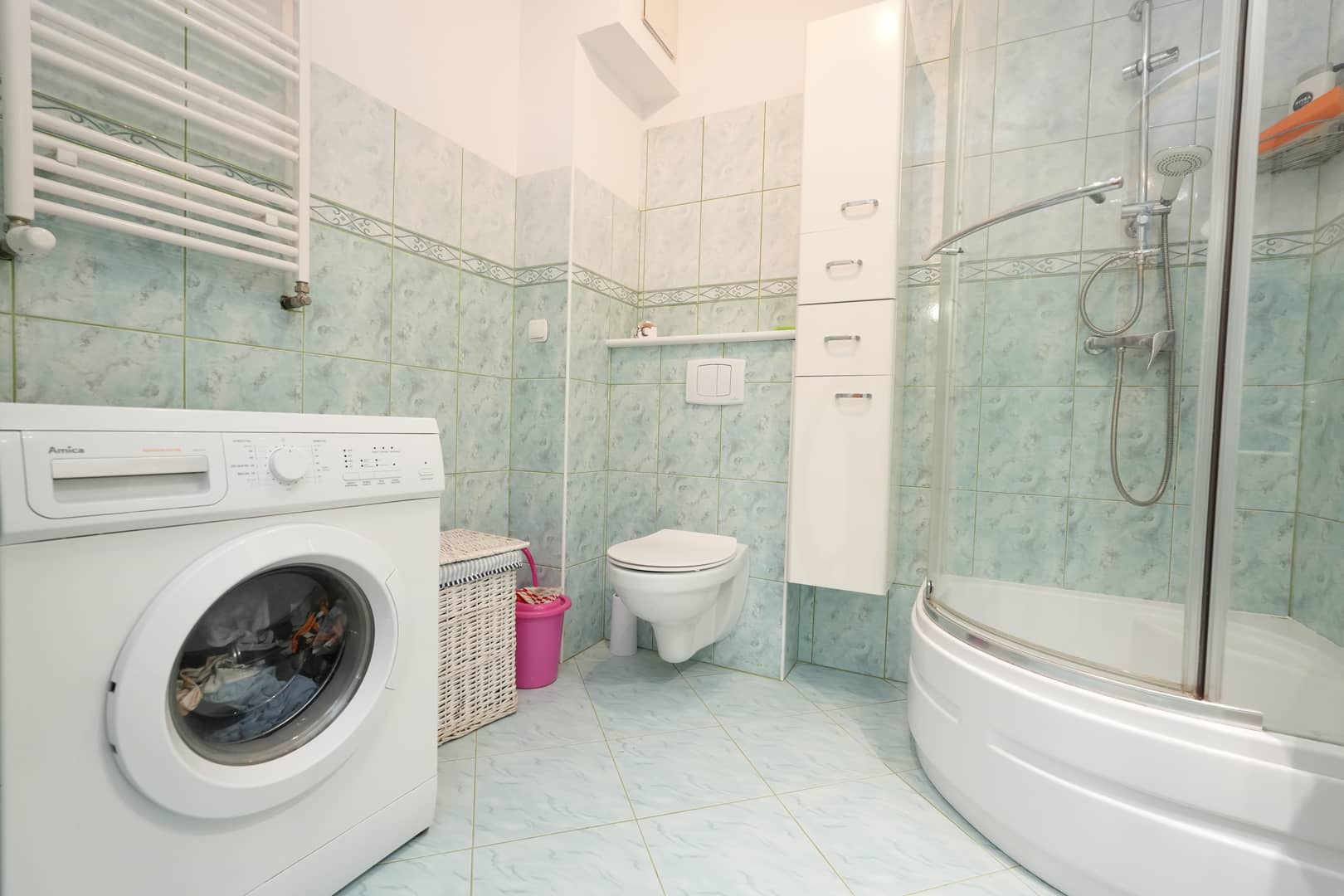 Na podłogach panele oraz kafle