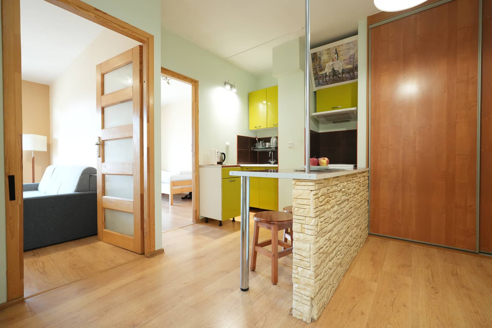 bardzo zgrabny apartament, Śródmieście, odświeżony do zamieszkania, z małym wyposażeniem kuchni, własność, 1 pokój, kuchnia, wc i łazienka razem, płytki i panele na podłogach, całość