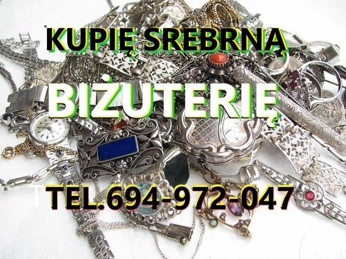 zegarki, srebrną biżuterię, srebrne cukiernice, sztućce, monety srebrne i