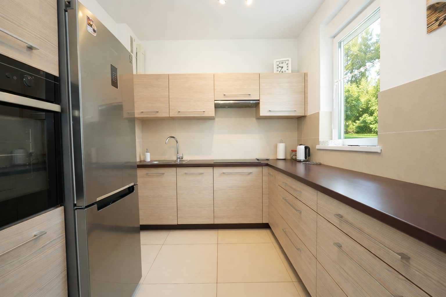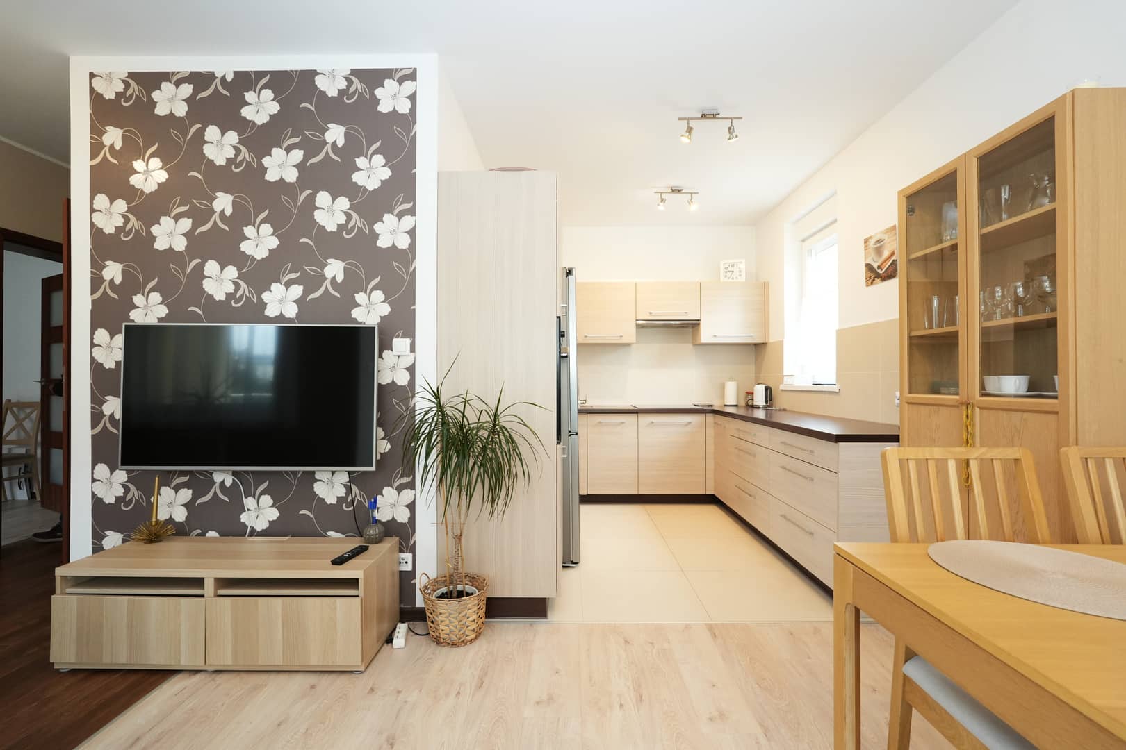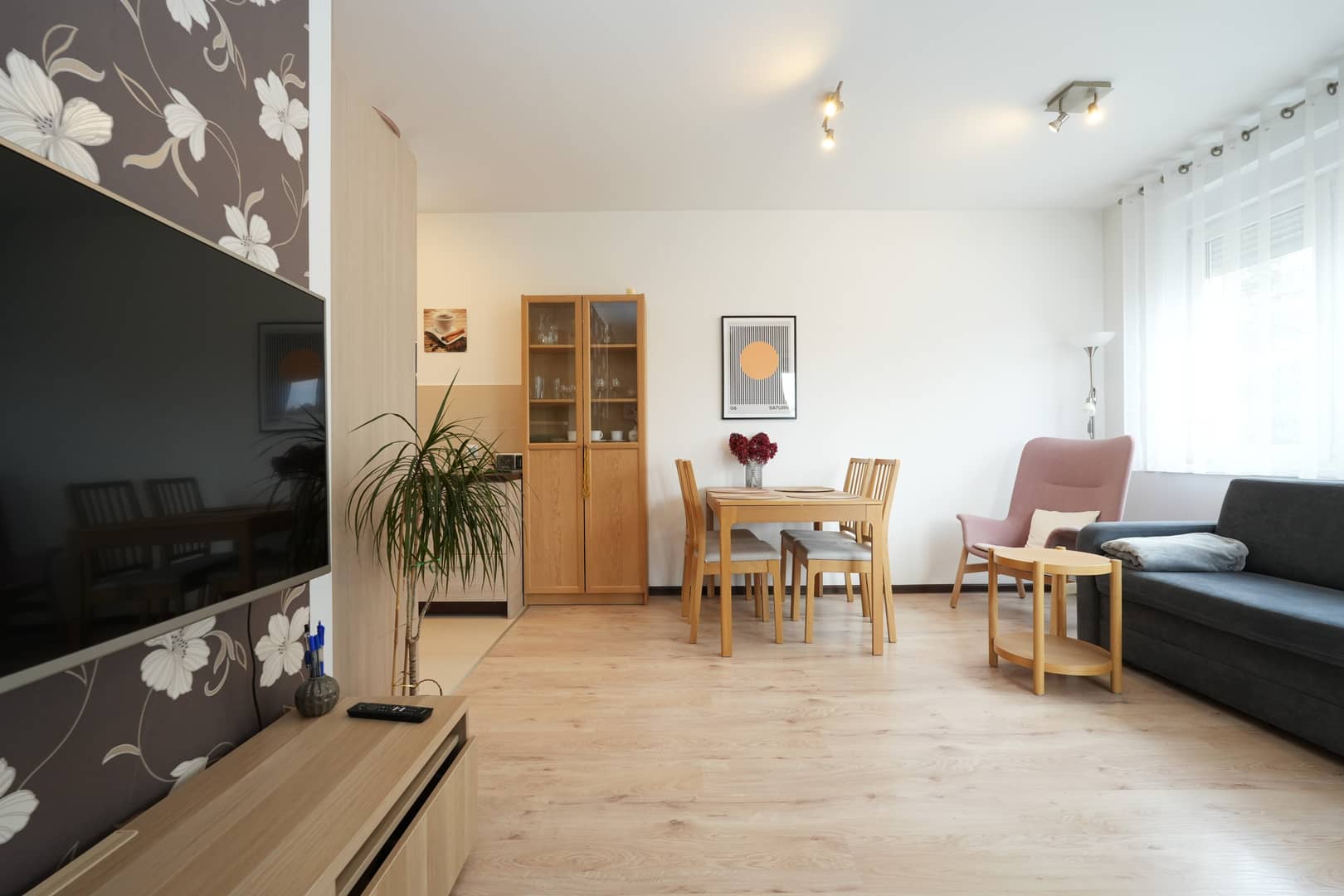 - Słoneczny salon z aneksem kuchennym oraz wyjściem na taras