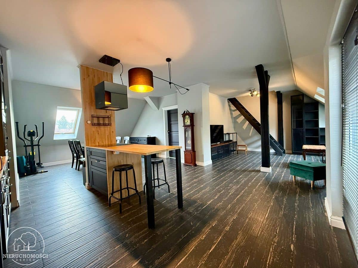 Mieszkanie w oryginale było trzypokojowe, właściciel na własne potrzeby rozebrał ścianę działową tworząc otwartą przestrzeń.