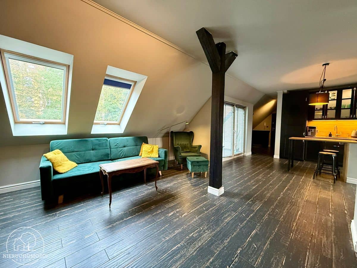 Mieszkanie do odświeżenia, na podłogach kafle, stolarka okienna PCV (okno balkonowe) oraz drewniana (okna dachowe).