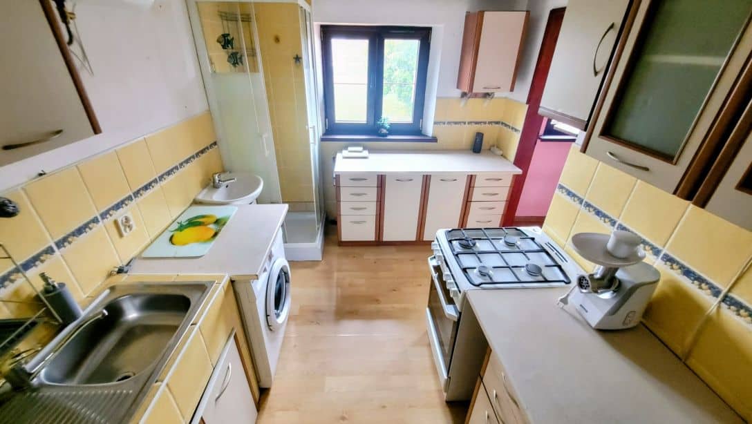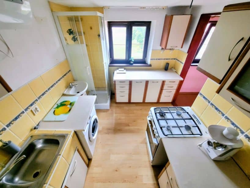 -nie ma tu toalety ( która jest na klatce schodowej metr od mieszkania ) a jedynie kabina prysznicowa i umywalka w kuchni ale wspólnota podjęła uchwałę, że przy okazji wymiany pionów poprowadzi rurę kanalizacyjną umożliwiającą zrobienie toalety z łazienką wewnątrz mieszkania. Prace mają się rozpocząć w najbliższym czasie