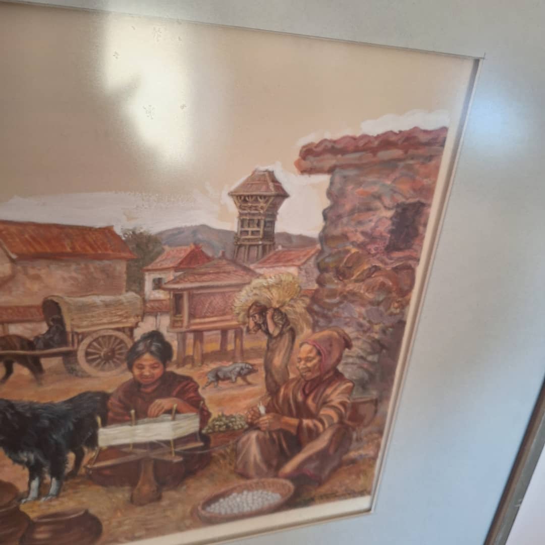 Obrazek scena rodzajowa z życia wiejskiego lub historycznego, postacie są tradycyjnych strojach. Wielkość 76/53 cm. Możliwy dowóz, cena 70 zł.