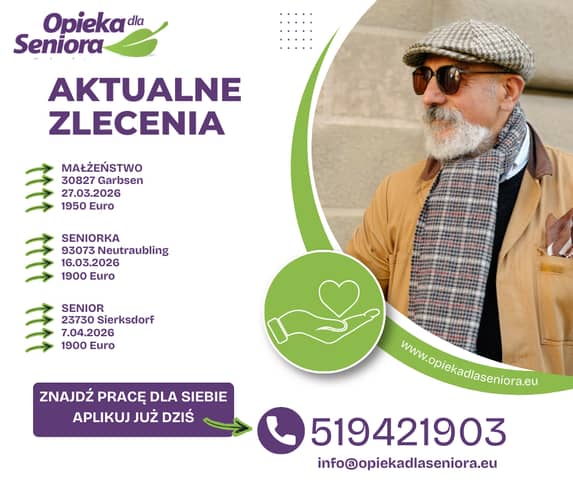 Zlecenie do Seniorki 93073 Neutraubling/ Bawaria Od 13.03.2026 Na 6 tygodni do 1900 EURO + opłacony przejazd Wymagania: dobra znajomość języka niemieckiego tel.: 519421903 / 690348626 / 7