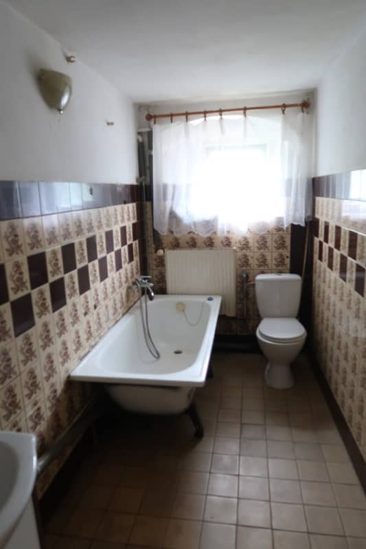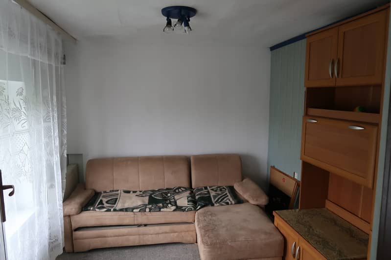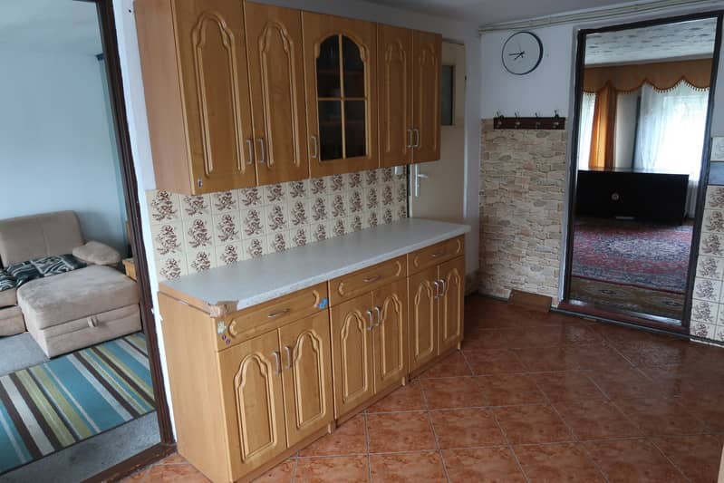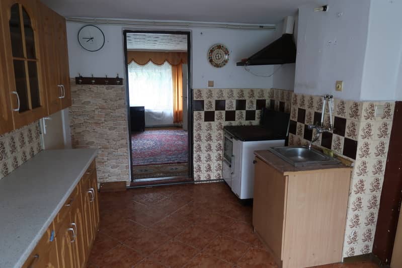 Połowa domu mieszkalnego- podział w pionie pow. 112 m2 , 3-pokoje, kuchnia – z kuchenką typu Westfalka, łazienka , korytarz, strych – możliwość zamieszkania i dalszej modernizacji, czy remontu. Wysokość w mieszkaniu 225 cm. W parterze pomieszczenie gospodarcze do zaadaptowania na piękny duży salon- 48,25 m2 . Mieszkanie częściowo po remoncie, wymieniono połowę okien na PCV, wymieniono połowę dachówki na betonową. Centralne ogrzewanie na ekogroszek. Dwa garaże murowane + wiata. Dodatkowo duży budynek gospodarczy – dawniej stodoła, z możliwością prowadzenia wybranej działalności lub składowania materiałów , sprzętu, przyczepy campingowej , quadów, czy Kampera. Czyste , wygodne podwórko. Przed domem mały skwer na kwiaty . Ponadto duża, osobna działka z możliwością zabudowy o pow. 1160 m2. Do posesji dojazd drogą asfaltową. Piękne , ciche położenie. Znakomita komunikacja. Widoki na góry, łąki. 320.000,-