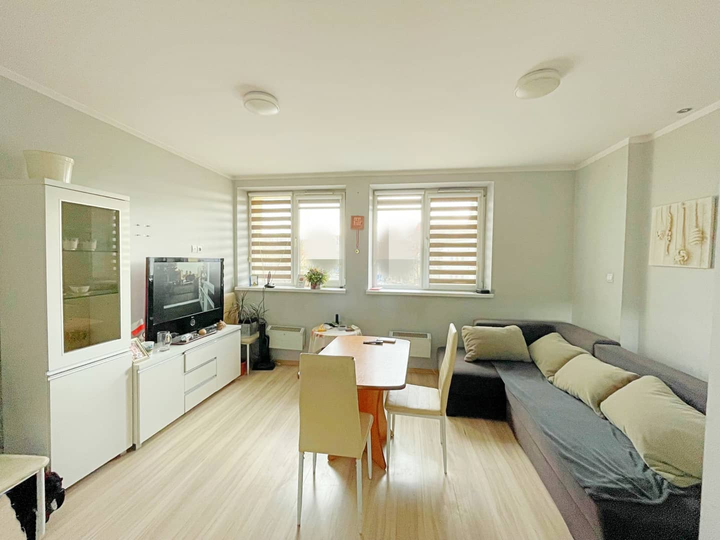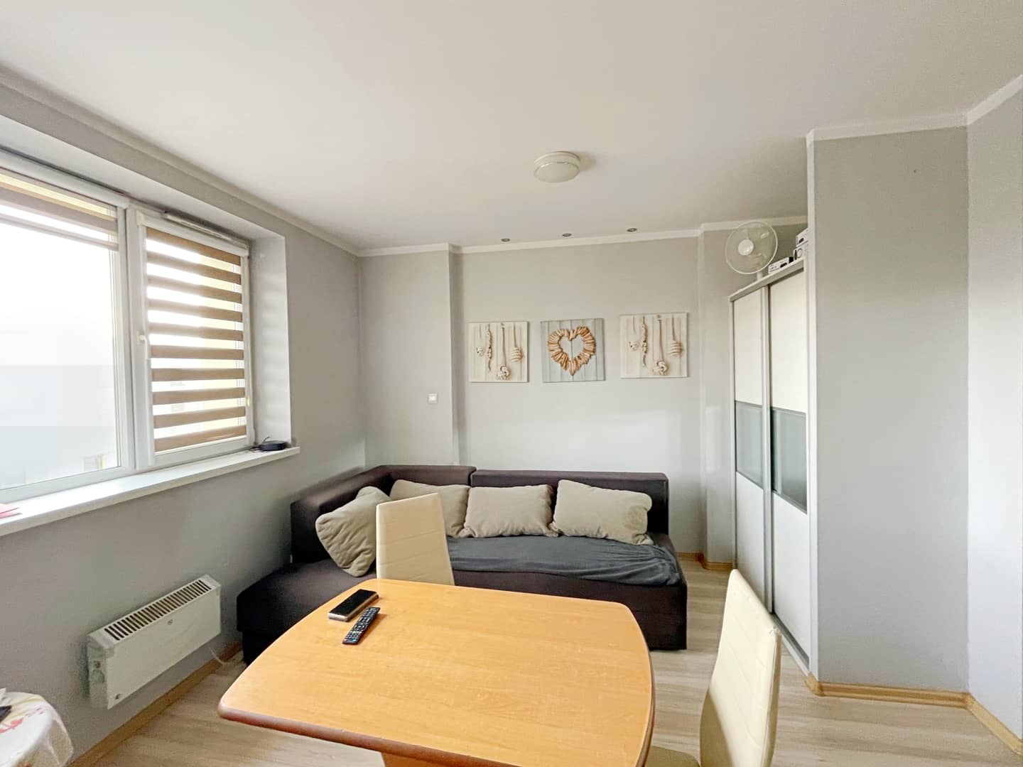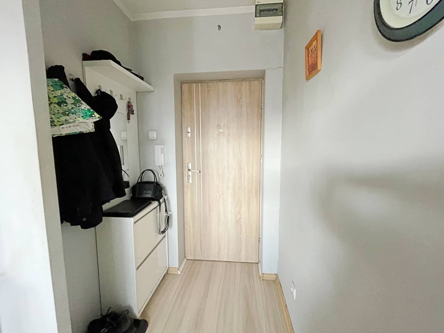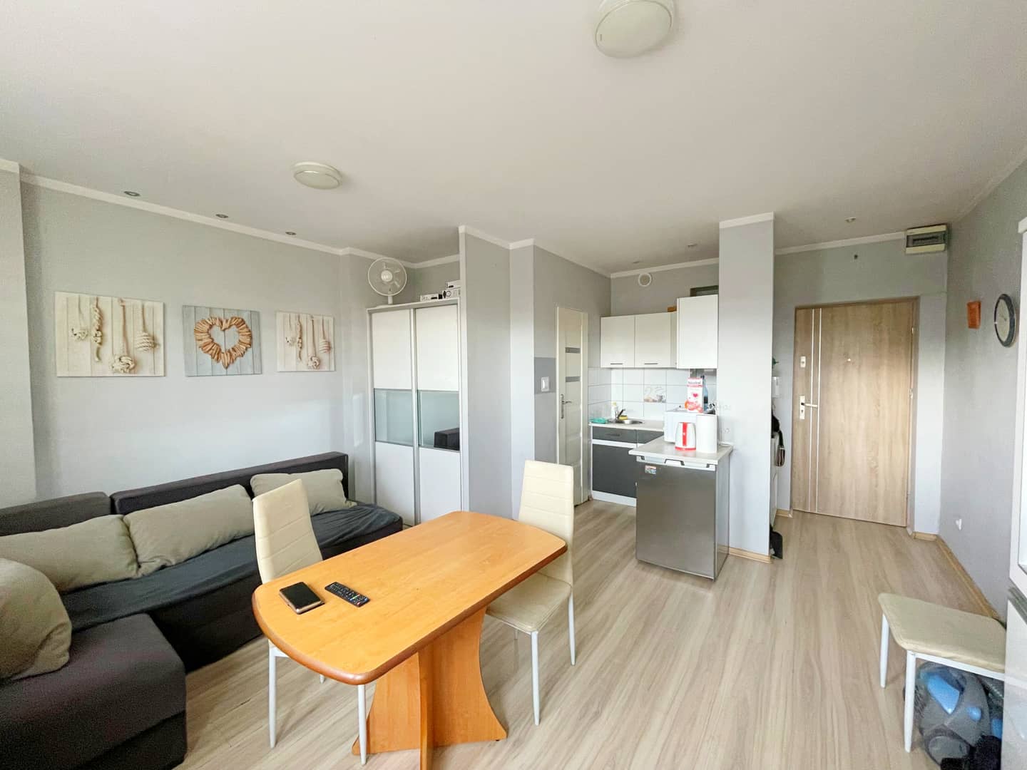 słoneczny i przestronny salon z pojemną szafą, funkcjonalny, umeblowany aneks kuchenny, łazienka z kabiną prysznicową oraz przedpokój.