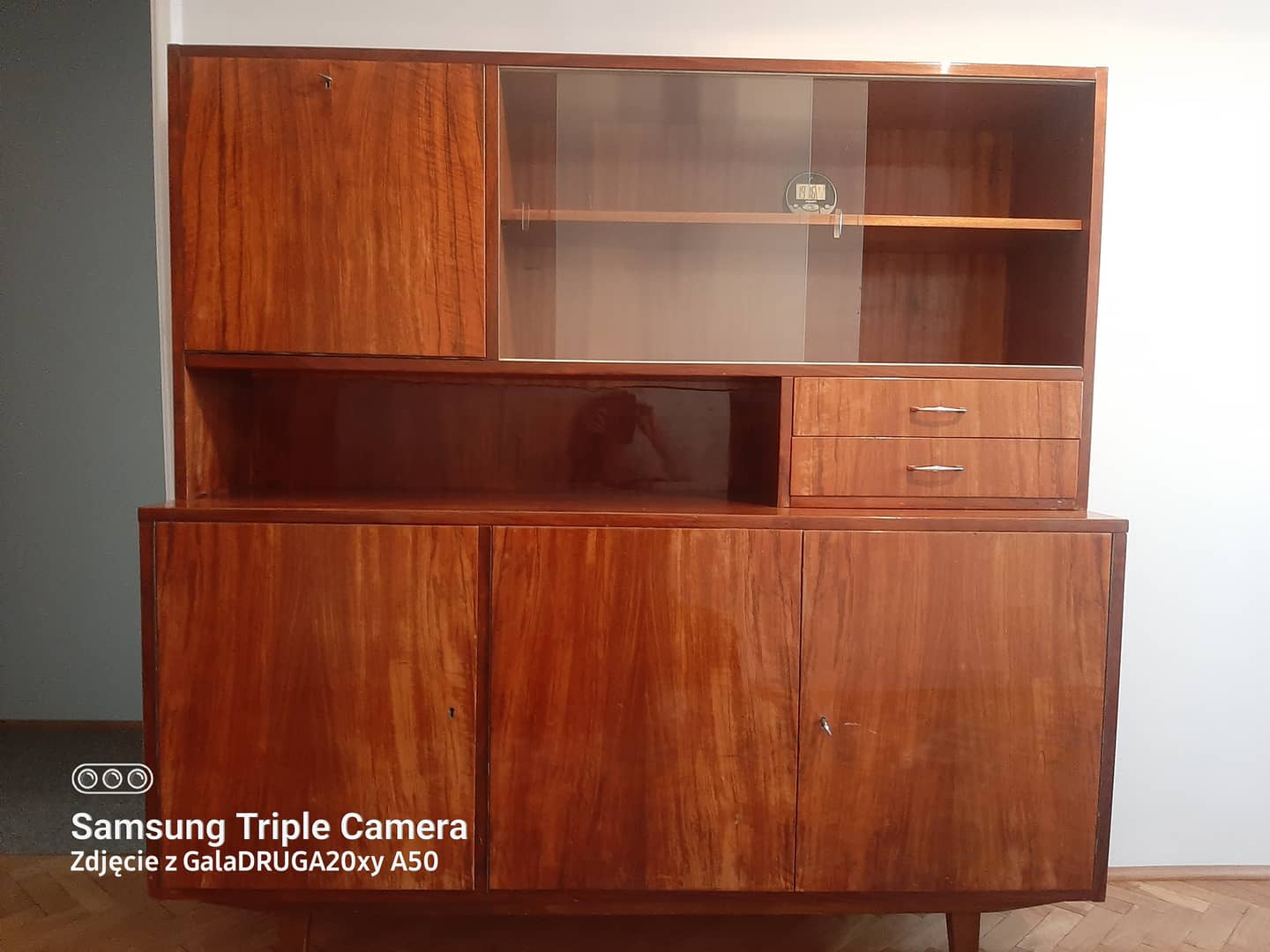Komplet mebli - wysoki połysk, lata 70-te, szafa dwudrzwiowa / wym. 180 cm/99 cm/głęb. -58 cm/ , kredens z witryną / 155 cm/153 cm/ głębokość - 45 cm, stół rozkładany / 110 cm/73 cm, wysokość. 74 cm, stan dobry, zadbane, Zabobrze I,