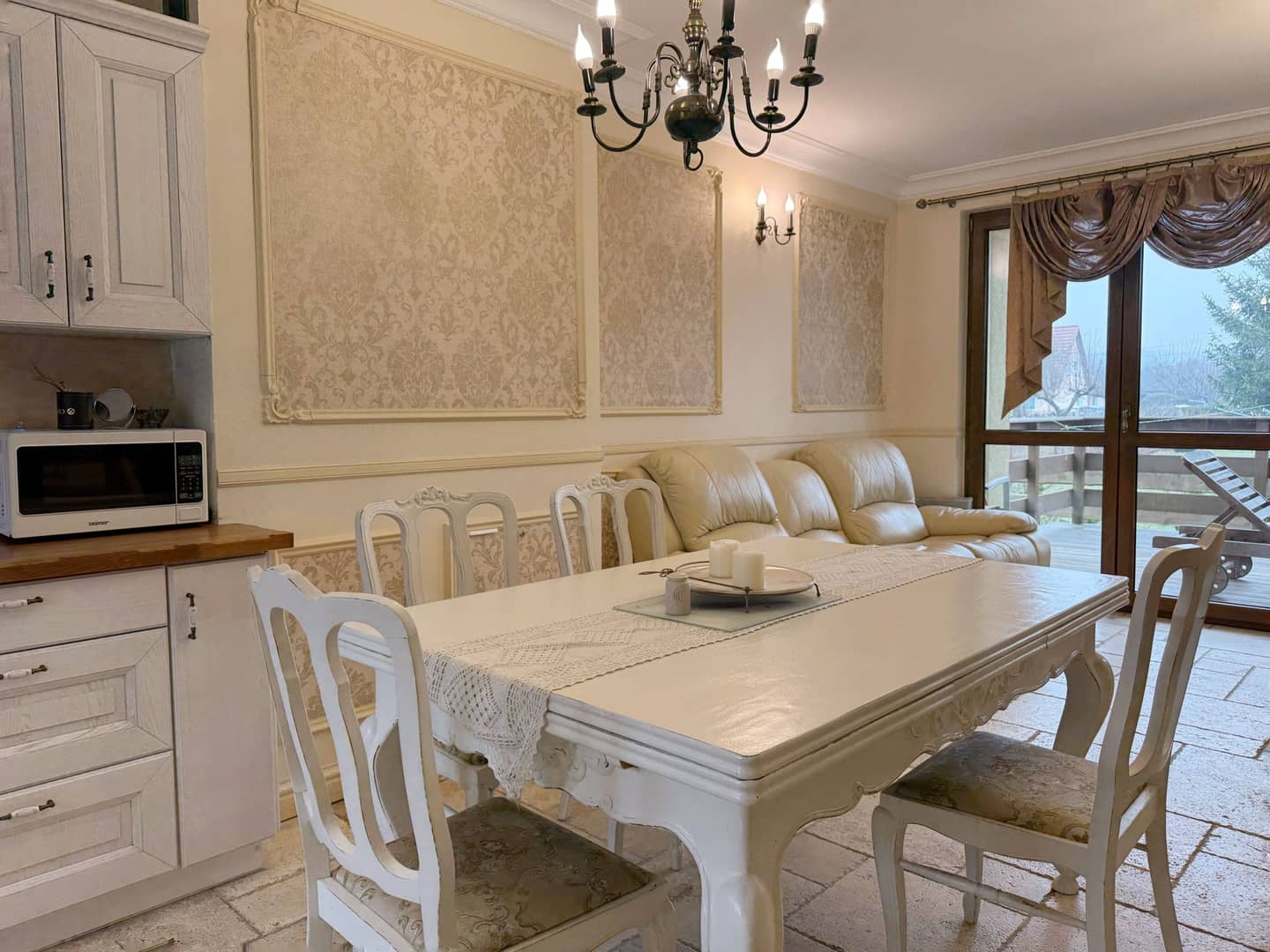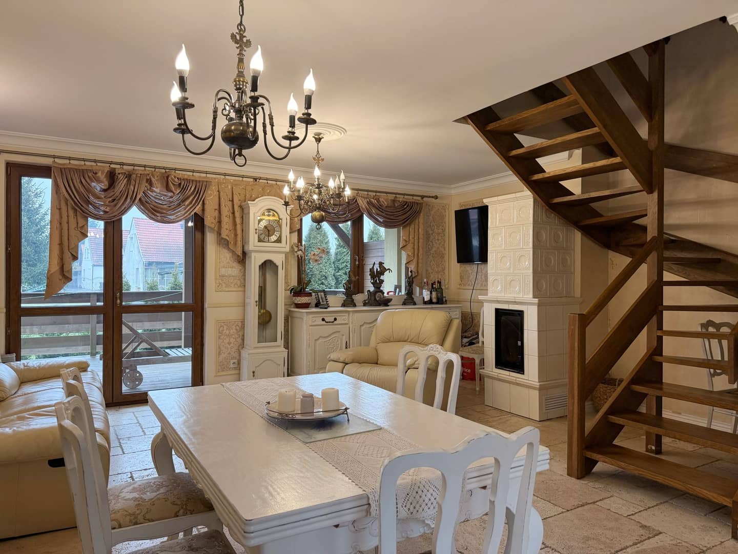 salon połączony z kuchnią i wyjściem na taras